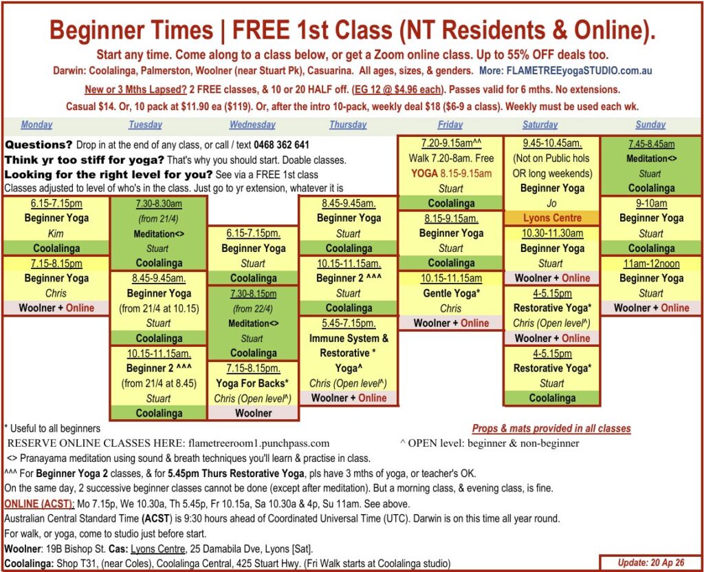 So, below, check out Flametree Yoga Darwin timetable for beginners.